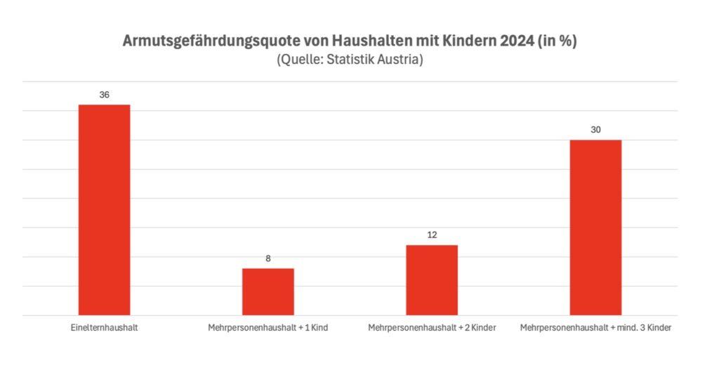 Das legt allein schon ein Blick auf Daten zur Armutsgefährdung nahe, die die Statistik Austria für Haushalte mit Kindern ausweist. Bei Paaren mit einem Kind beträgt die Quote acht, bei Paaren mit zwei Kindern zwölf und bei ebensolchen mit mindestens drei Kindern schon 30 Prozent. Weiter reichen die Angaben nicht. Bei sechs, sieben und mehr Kindern könnte es sich demnach aber durchaus um 50 Prozent und mehr handeln. Ausgewiesen wird nur noch die Quote für Alleinerzieherinnen-Haushalte. Bei ihnen beträgt sie ganze 36 Prozent.