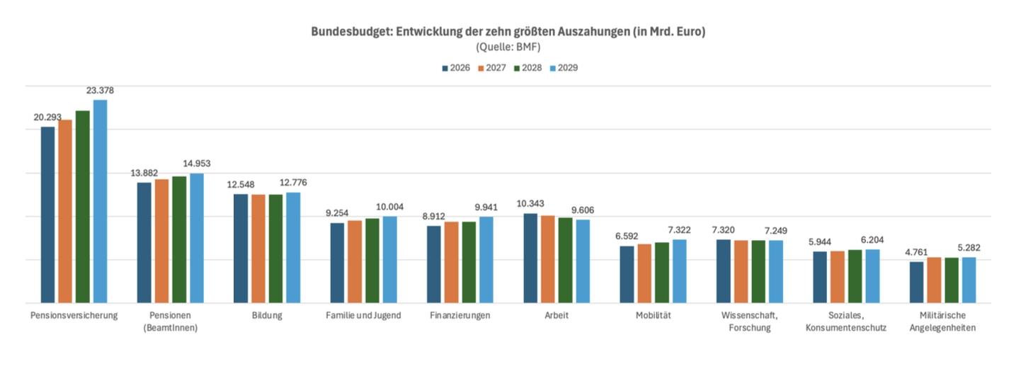 Im Bundesbudget fallen Pensionen zunehmend stärker ins Gewicht. Heuer machen die Auszahlungen für die Pensionsversicherung (Ausfallhaftung etc.) sowie die Ruhebezüge der Beamtinnen und Beamten voraussichtlich 27 Prozent aller Auszahlungen aus, 2029 könnte es sich laut Rahmenplan des Finanzministeriums um 29 Prozent handeln.
