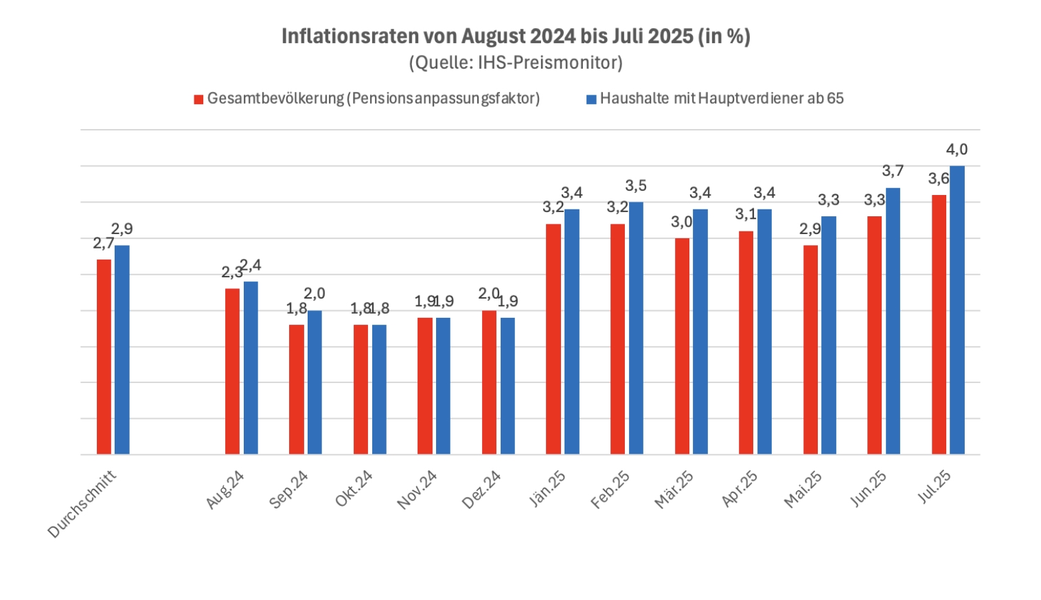 Heute betreibt das Institut für Höhere Studien (IHS) einen Preismonitor, in dem auf Basis von Konsumerhebungen Indexwerte für einzelne Bevölkerungsgruppen ausgewiesen sind. Für Haushalte mit ab 65-jährigem Hauptverdiener belief sich die Inflationsrate demnach im Juli nicht auf 3,6, sondern auf vier Prozent. Und: Für sie hat die durchschnittliche Inflationsrate seit August 2024 nicht 2,7, sondern 2,9 Prozent betragen. Nicht 2,7, sondern 2,9 Prozent müsste denn auch der Anpassungsfaktor sein, wenn man das als Basis für Pensionen heranziehen würde.