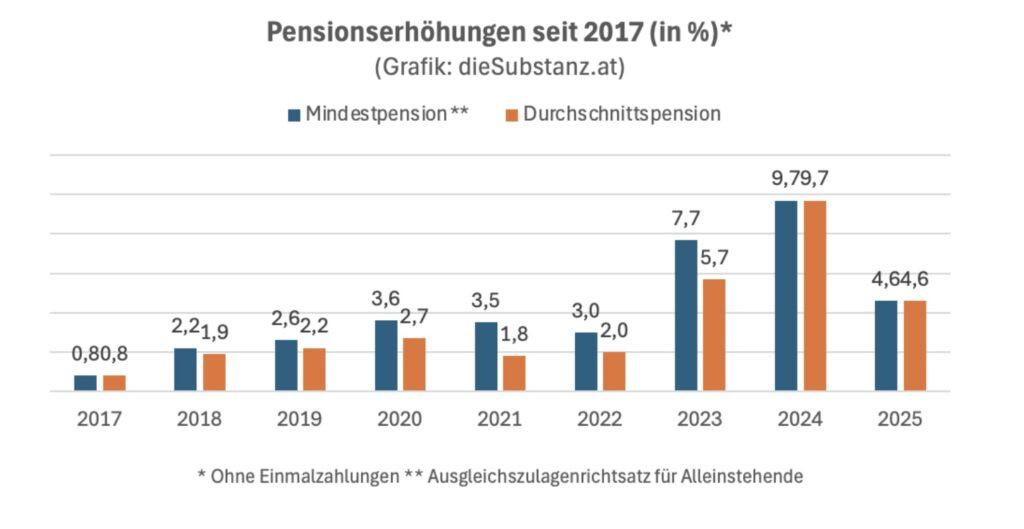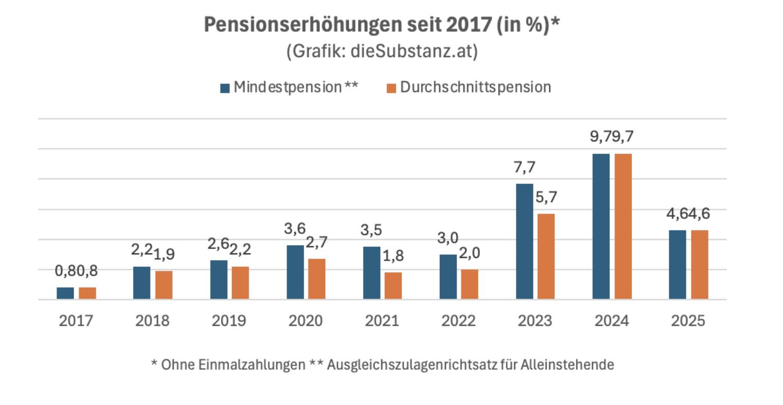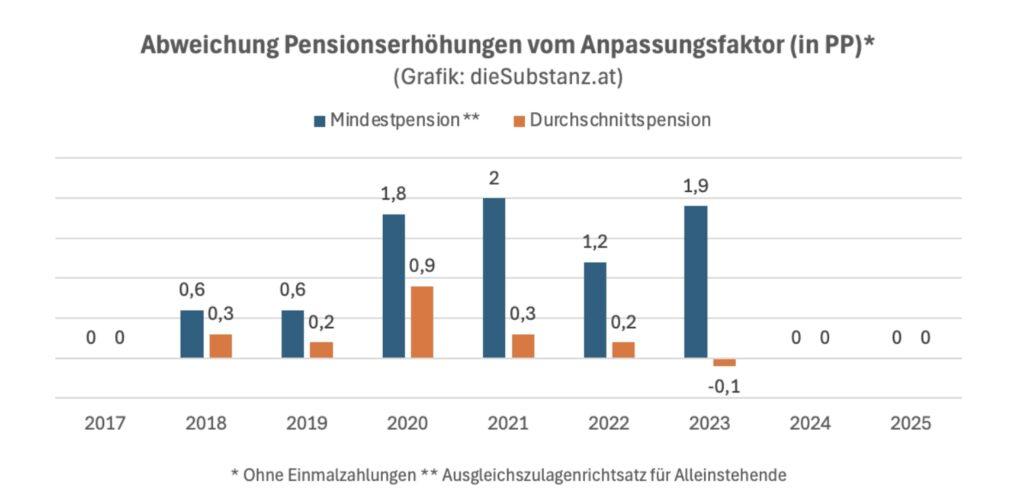 Schaut man sich die Anpassungen der vergangenen Jahre seit 2017 an, könnte man jedoch meinen, die budgetäre Not sei ein Dauerzustand. Zumindest auf den ersten Blick: Sechs von neun Mal gab es eine soziale Staffelung. Mindestpensionen wurden jedenfalls so oft stärker erhöht als Durchschnittspensionen.