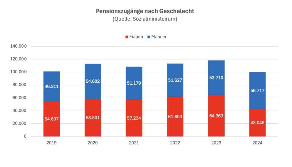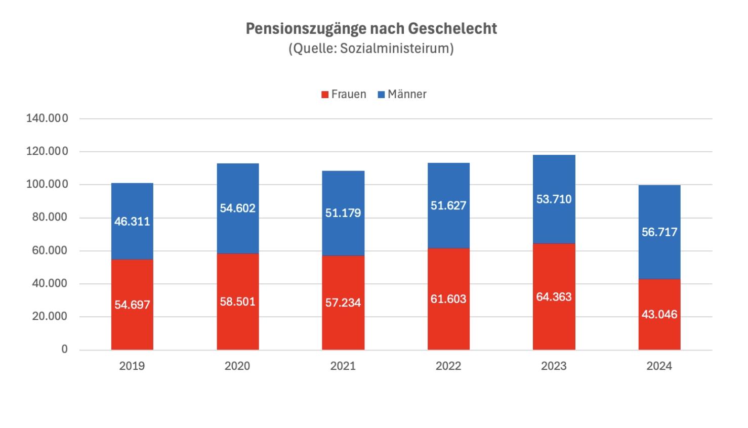 Die Erklärung ist einfach: Das gesetzliche Pensionsalter von Frauen steigt seit 1. Jänner 2024 schrittweise von 60 auf 65 Jahre. Dadurch wird der Pensionszugang quasi blockiert, konnten im vergangenen Jahr mit rund 43.000 um ein Drittel weniger Frauen in Pension gehen als 2023. Bei Männern hat der Pensionszugang hingegen weiter leicht zugenommen.