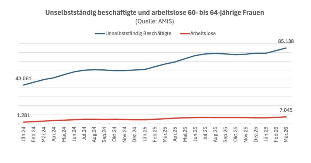 Allerdings: Ursprünglich war die Arbeitslosigkeit aufgrund des Pensionsalters von 60 Jahren sehr gering. Abgesehen davon ist seit 2024 auch die Zahl der unselbständig beschäftigten Frauen in dieser Altersgruppe gestiegen. Und zwar auf ein viel höheres Niveau: Sie hat sich auf rund 85.000 verdoppelt.