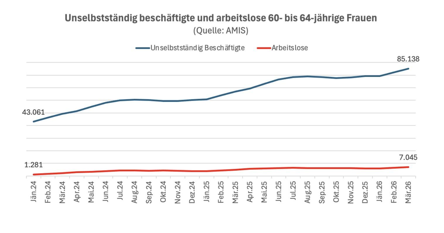 Die Anhebung des gesetzlichen Pensionsalters von Frauen läuft seit 2024. Es wird jedes Jahr um ein halbes Jahr erhöht. Derzeit beträgt es 61,5. Die Zahl der arbeitslosen 60- bis 64-Jährigen ist in dieser Zeit tatsächlich stark gestiegen; österreichweit hat sie sich nicht nur verdreifacht, sondern (auf 7045 im März) verfünfeinhhalbfacht.