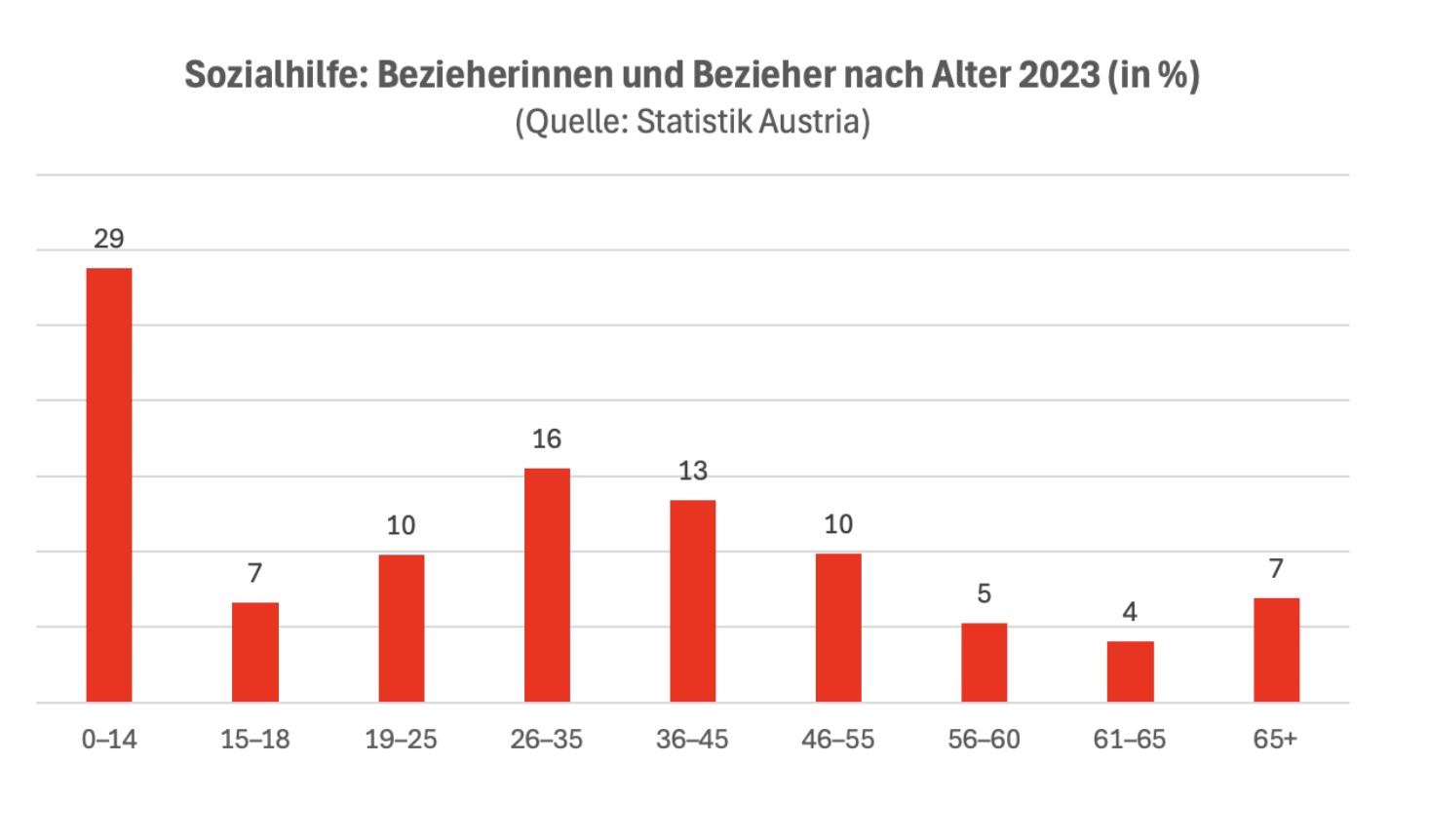 Die Regierung geht nun eine Reform an. Anlass, einen Blick darauf zu werfen, wer die Sozialhilfe bezieht. Datenbasis: Statistik Austria für das Jahr 2023. Nach Alter fällt auf, dass es sich bei 29 Prozent um Kinder handelt, deren Schicksal ihre Eltern sind, was die Ansage aus Wien, für sie eine Kindergartenpflicht ab 3 einzuführen, vernünftig erscheinen lässt.
