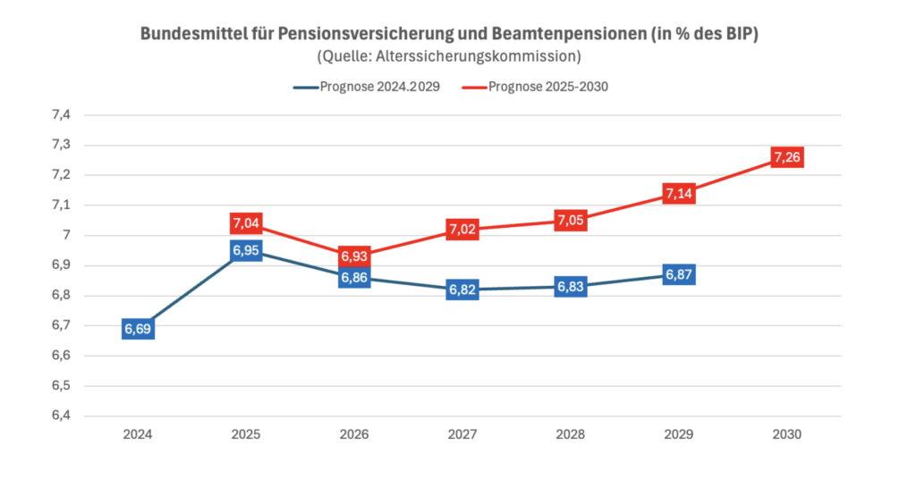 Laut dieser Prognose werden die Bundesmittel für die Pensionsversicherung nach einem vorübergehenden Rückgang bis 2030 stärker steigen als bisher angenommen. In der Vorjahresprognose (2024 bis 2029) ist davon ausgegangen worden, dass sie 2029 3,83 Prozent des BIP ausmachen werden. Jetzt wird mit 4,06 Prozent gerechnet – bei dann weiter steigender Tendenz.