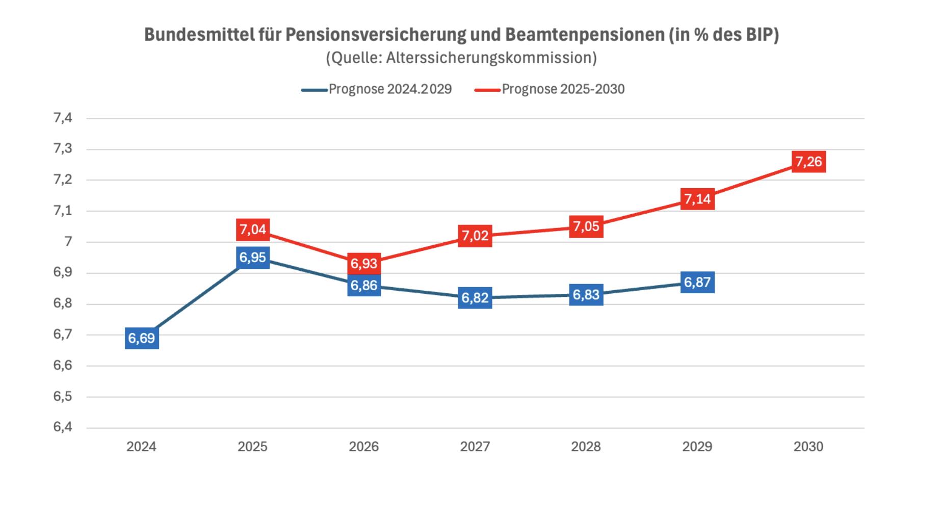 Parallel dazu sinken die Ausgaben für Beamtenpensionen. Grund: Es gibt immer weniger Beziehende. Das bremst den Anstieg der Gesamtausgaben für Pensionen aus dem Bundesbudget, kann ihn aber nicht ausgleichen. In Summe werden heuer laut Alterssicherungskommission 7,04 Prozent des BIP zusammenkommen. 2026 wird es sich mit 6,93 Prozent zwar um etwas weniger handeln, dann geht die Kurve aber nach oben – Richtung 7,26 Prozent im Jahr 2030.