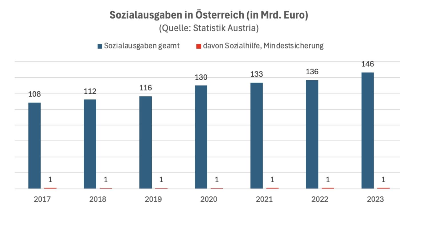 In Bezug auf die Sozialhilfe ist sehr vieles relativ: Man könnte glauben, es gehe um endlich viel. Dabei machen die Ausgaben laut Statistik Austria gut eine Milliarde Euro aus und sind im Unterschied zu den gesamtstaatlichen Sozialausgaben in ihrer Entwicklung relativ konstant. Siehe Grafik, durch die vor allem dies verdeutlicht werden soll: Es geht hier nicht um nichts, aber um deutlich weniger als ein Prozent aller Sozialausgaben.