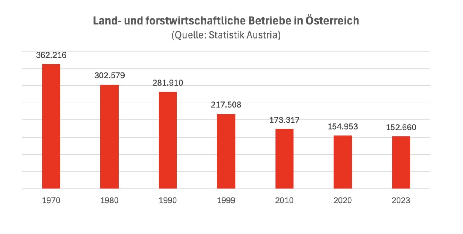 Die Veränderungen, die laufen, sind riesig. Beispiel: 1970 gab es vom Boden- bis zum Neusiedlersee noch etwas mehr als 360.000 land- und forstwirtschaftliche Betriebe. Zuletzt, bei einer Statistik-Austria-Erhebung 2023, handelte es sich mit 152.660 nicht einmal mehr um halb so viele. Die Zahl der Landwirtschaften allein (ohne Forstwirtschaften) dürfte überhaupt schon unter 100.000 gesunken sein. 2023 lag sie nur noch knapp darüber.