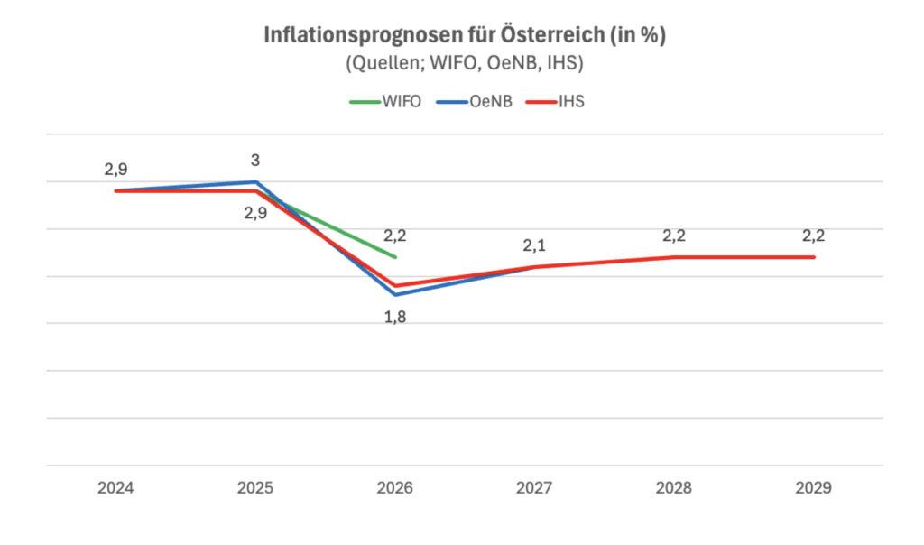 Mit 1. Jänner 2026 wird der Effekt wegfallen. Die Folge: Die Inflationsrate wird zurückgehen. Die Institute sowie die Nationalbank gehen von 1,8 bis 2,1 Prozent im kommenden Jahr aus. Bis zum Ende der Legislaturperiode bzw. der nächsten Nationalratswahl voraussichtlich 2029 könnte sich die Rate laut IHS-Prognose vom Juni bei 2,2 Prozent stabilisieren.